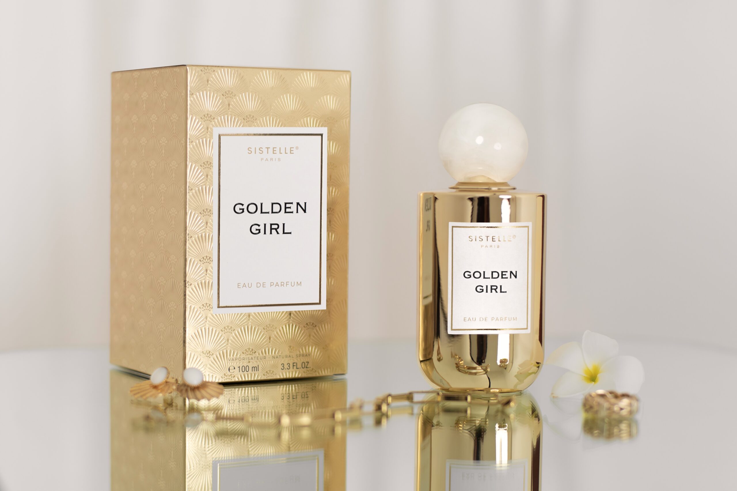 GOLDEN GIRL sở hữu vẻ ngoài khiến bất cứ quý cô nào cũng muốn sở hữu ngay lập tức. Thân chai thủy tinh được mạ vàng bóng bẩy, phản chiếu ánh sáng lấp lánh như một thỏi vàng ròng quý giá. Điểm nhấn đắt giá nhất chính là chiếc nắp tròn trắng muốt tựa như một viên ngọc trai đại dương, tạo nên sự tương phản hoàn hảo giữa nét quyền quý và sự tinh khôi. Vỏ hộp với họa tiết rẻ quạt Art Deco dập nổi tinh xảo, biến Golden Girl thành một món đồ trang sức thượng lưu trên bàn trang điểm của bạn.