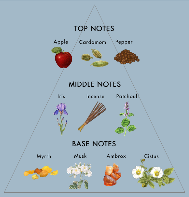 • Hương đầu: Táo, Bạch đậu khấu, Tiêu